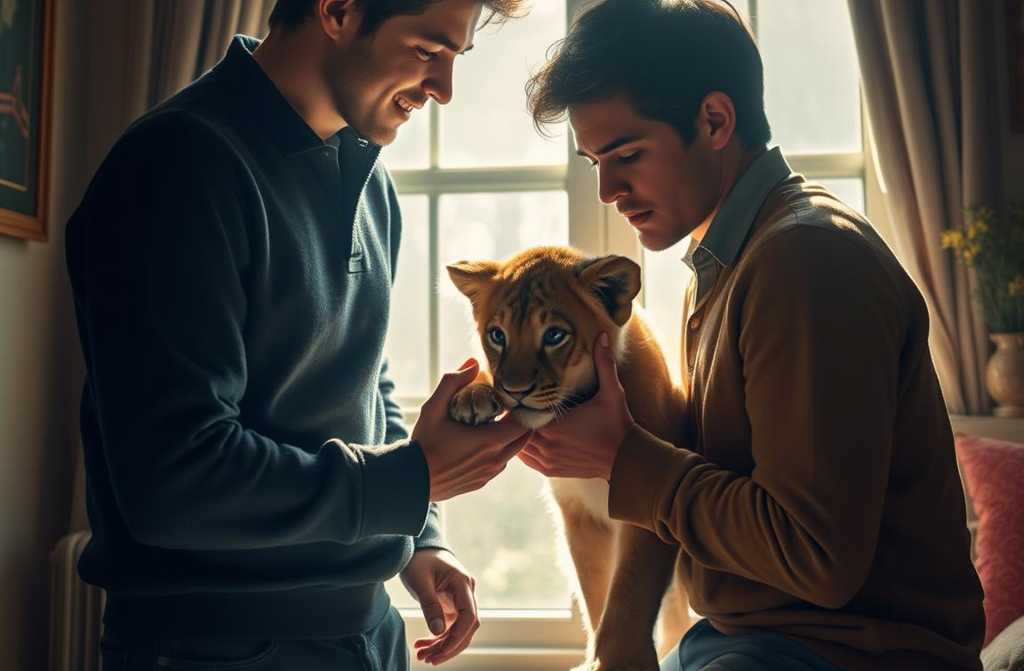 Un día, paseando por las calles, encontraron una pequeña tienda de animales exóticos. En el escaparate había pájaros, monos y reptiles, pero algo llamó su atención: una jaula diminuta donde reposaba un cachorro de león. El animal apenas era más grande que un gato, con unos ojos tristes que parecían entenderlo todo.