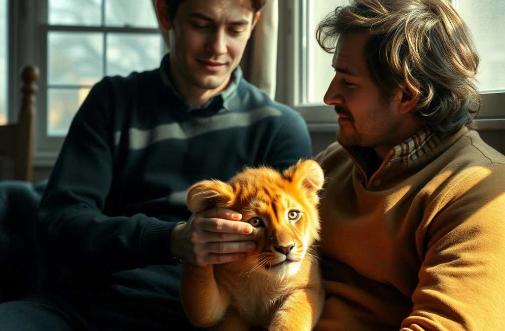 Un día, paseando por las calles, encontraron una pequeña tienda de animales exóticos. Desde el escaparate, aves, monos y reptiles los observaban, pero fue una pequeña jaula lo que captó su atención. Dentro yacía un cachorro de león, apenas más grande que un gatito, con ojos tristes que parecían entenderlo todo.