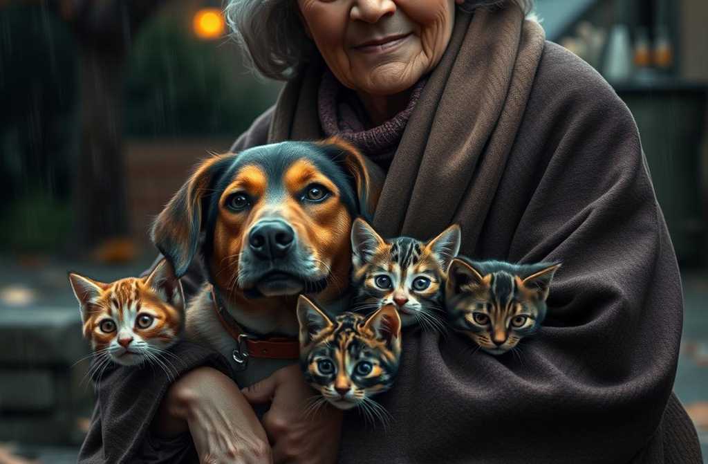 Fue la anciana del primer piso, la gruñona de siempre, la que no pudo soportarlo más. Salió bajo la lluvia, en bata, maldiciendo al mundo entero. Recogió a los gatitos, abrazó a Pelusa y le gritó a Corgi: