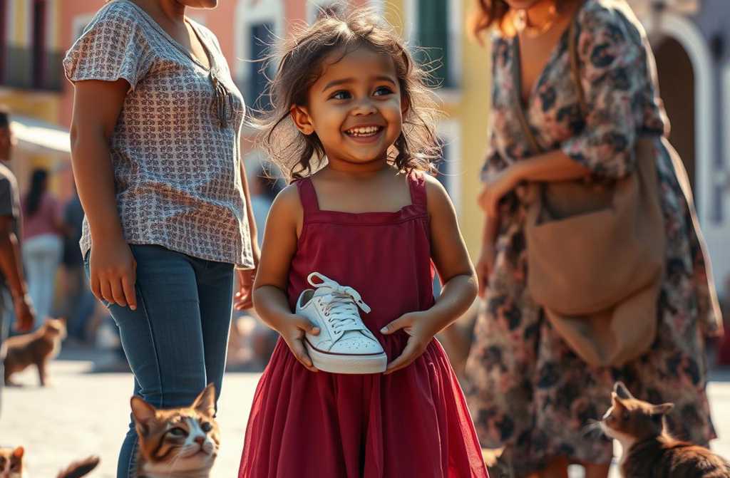 Una tarde, mientras Lucía recogía migajas de la plaza tras el bullicio del mercado, una mujer extranjera la vio y fijó sus ojos en sus pies, curtidos por el suelo áspero. Se acercó con dulzura.