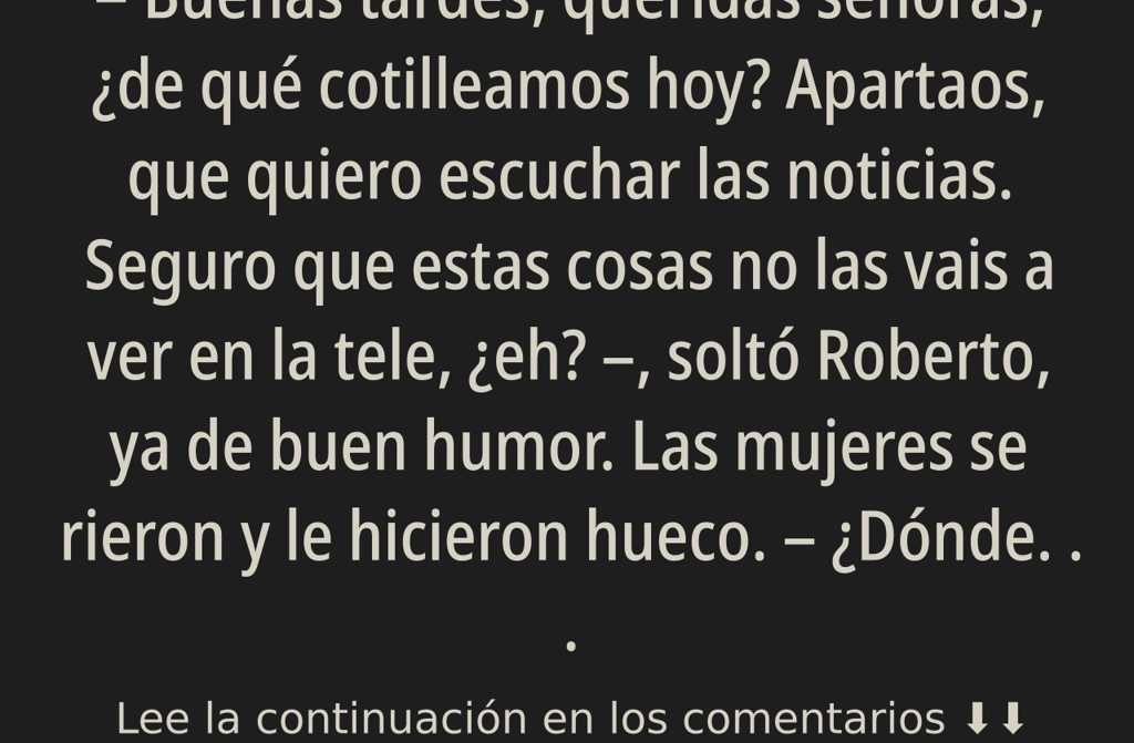 Buenas tardes, queridas señoras, ¿de qué cotilleamos hoy? Apartaos, que quiero escuchar las noticias. Seguro que estas cosas no las vais a ver en la tele, ¿eh? , soltó Roberto, ya de buen humor. Las mujeres se rieron y le hicieron hueco.