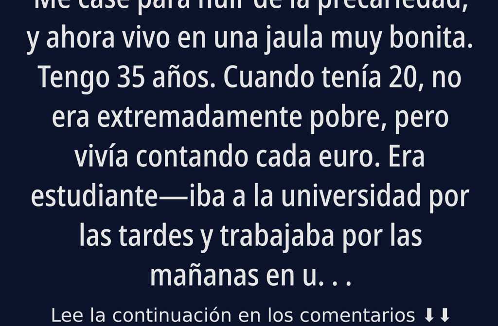 Me casé para huir de la precariedad, y ahora vivo en una jaula muy bonita. Tengo 35 años. Cuando tenía 20, no era extremadamente pobre, pero vivía contando cada euro. Era estudianteiba a la universidad por las tardes y trabajaba por las mañanas en una panadería. Llegaba a casa agotada, con los pies hinchados, pensando si ese mes me alcanzarían los euros para el transporte, las copias, la comida y las tasas. Soñaba con una vida más tranquila; no lujosa, sino simplemente estable.