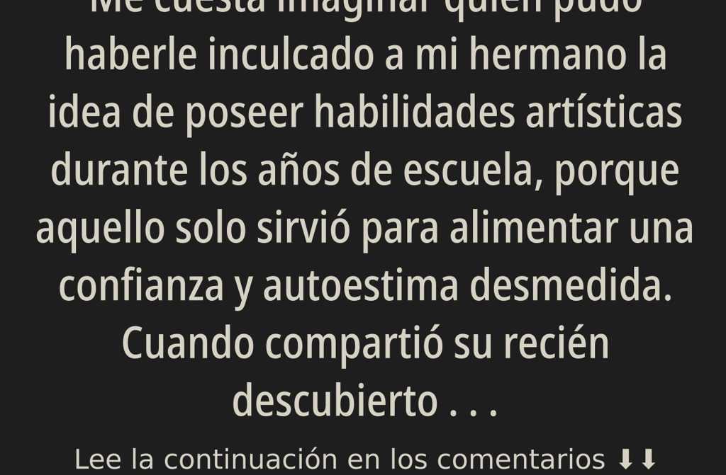 Me cuesta imaginar quién pudo haberle inculcado a mi hermano la idea de poseer habilidades artísticas durante los años de escuela, porque aquello solo sirvió para alimentar una confianza y autoestima desmedida. Cuando compartió su recién descubierto talento con nuestros padres, decidieron apoyarle inscribiéndole en una academia de pintura. Sin embargo, tras unas pocas clases, decidió arrogantemente que ya sabía todo lo necesario y abandonó el curso. Mis padres esperaban que, antes de terminar el bachillerato, dejaría a un lado sus aspiraciones artísticas, pero él persistió e incluso intentó ingresar en una escuela de arte. Desgraciadamente, no fue aceptado, pues sus cuadros no convencieron a los profesores, aunque él insistía obstinadamente en que el verdadero talento no dependía de un título y siguió pintando.