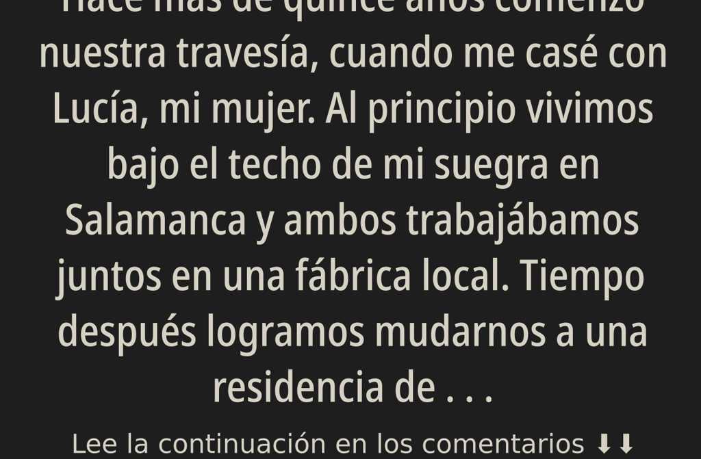 Hace más de quince años comenzó nuestra travesía, cuando me casé con Lucía, mi mujer. Al principio vivimos bajo el techo de mi suegra en Salamanca y ambos trabajábamos juntos en una fábrica local. Tiempo después logramos mudarnos a una residencia de estudiantes y la vida parecía fluir sin dificultades. Al percibir el potencial de la carrera de Lucía, la animé a que cursara estudios universitarios mientras yo me ocupaba de las tareas domésticas y le ayudaba con sus apuntes, informes y ensayos, para facilitarle el camino. Aunque mi propia carrera nunca despegó, a pesar de mi licenciatura, encontré consuelo en la felicidad que reinaba en nuestro hogar.