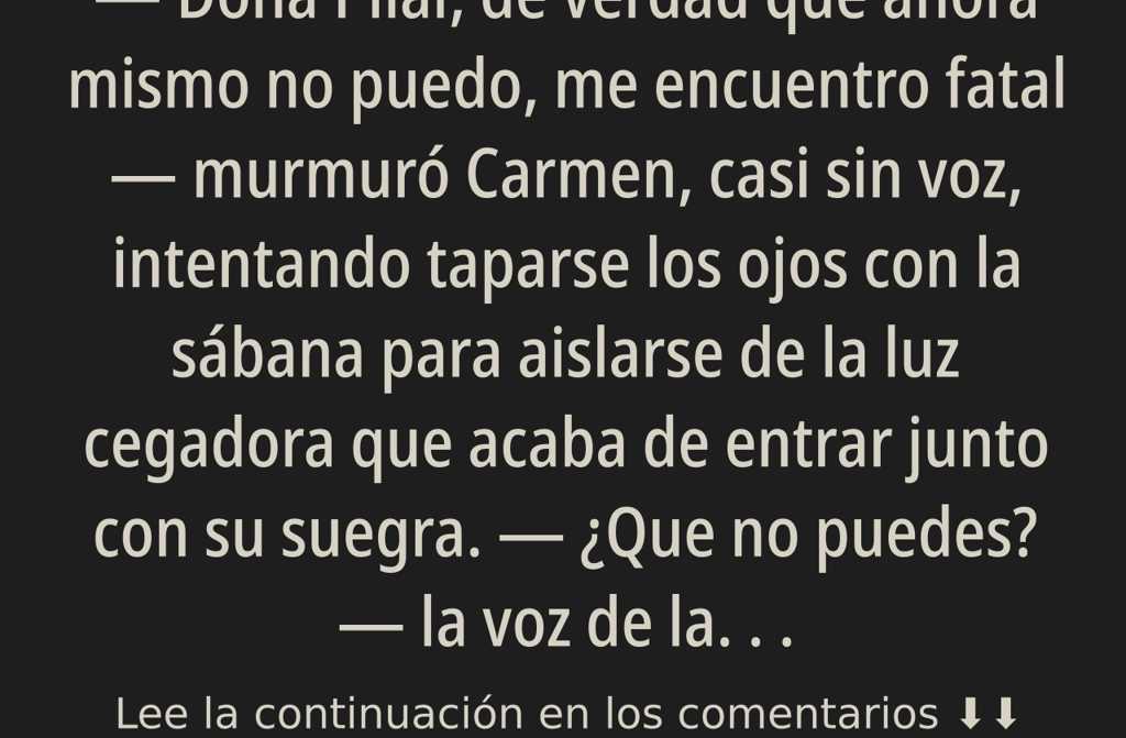 Doña Pilar, de verdad que ahora mismo no puedo, me encuentro fatal murmuró Carmen, casi sin voz, intentando taparse los ojos con la sábana para aislarse de la luz cegadora que acaba de entrar junto con su suegra.