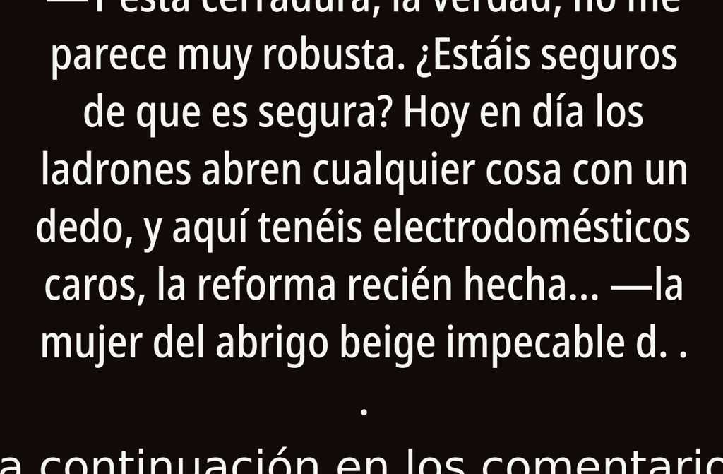 Y esta cerradura, la verdad, no me parece muy robusta. ¿Estáis seguros de que es segura? Hoy en día los ladrones abren cualquier cosa con un dedo, y aquí tenéis electrodomésticos caros, la reforma recién hecha la mujer del abrigo beige impecable dio un golpecito desconfiado en la flamante puerta metálica, aún impregnada de ese olor a fábrica.