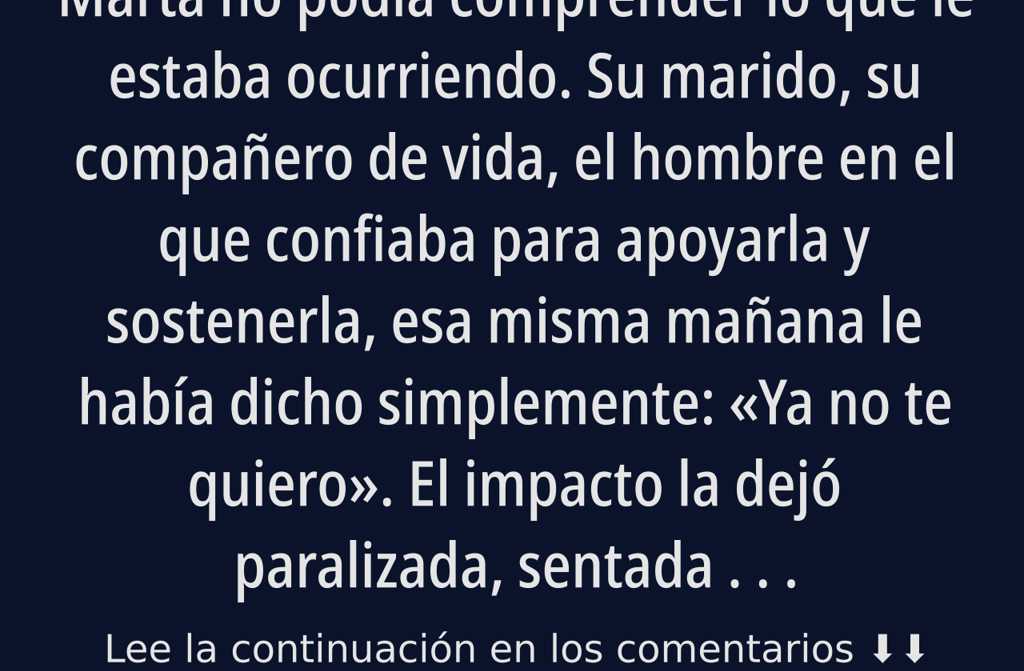 Marta no podía comprender lo que le estaba ocurriendo. Su marido, su compañero de vida, el hombre en el que confiaba para apoyarla y sostenerla, esa misma mañana le había dicho simplemente: «Ya no te quiero».
