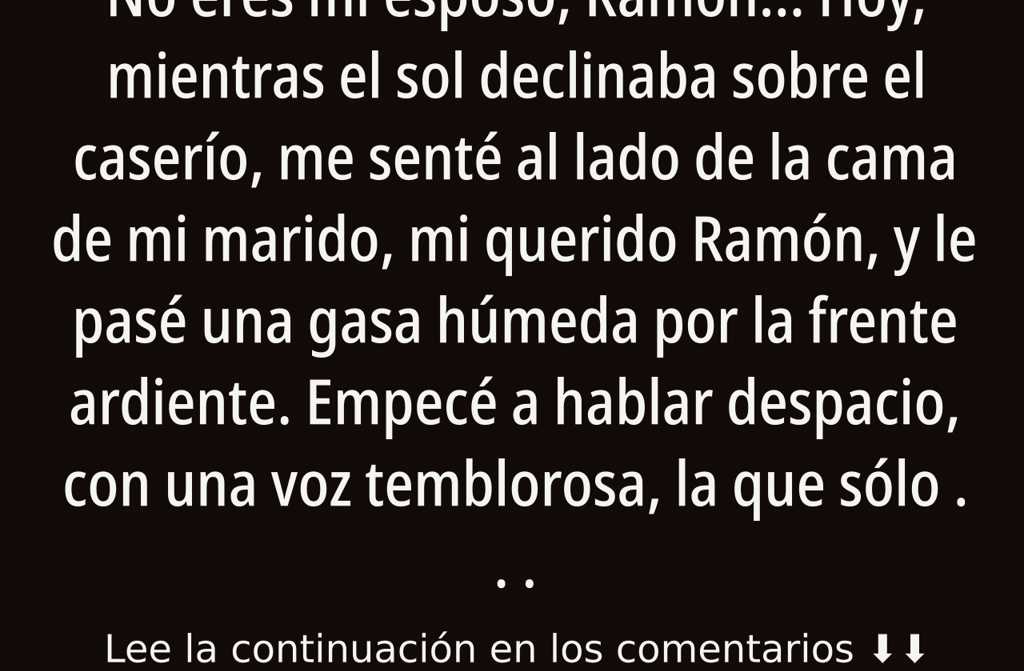 Hoy, mientras el sol declinaba sobre el caserío, me senté al lado de la cama de mi marido, mi querido Ramón, y le pasé una gasa húmeda por la frente ardiente. Empecé a hablar despacio, con una voz temblorosa, la que sólo sale de mi garganta cuando la vergüenza aprieta.