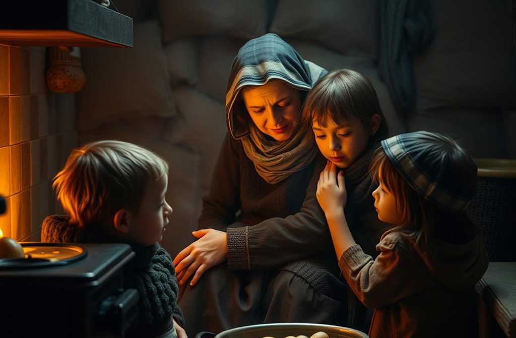 En el fogón hervía una pequeña olla de patatas, y en la chimenea ardía un leño delgado, el último del montón. Ana abrazó a sus hijos y rezó en silencio: