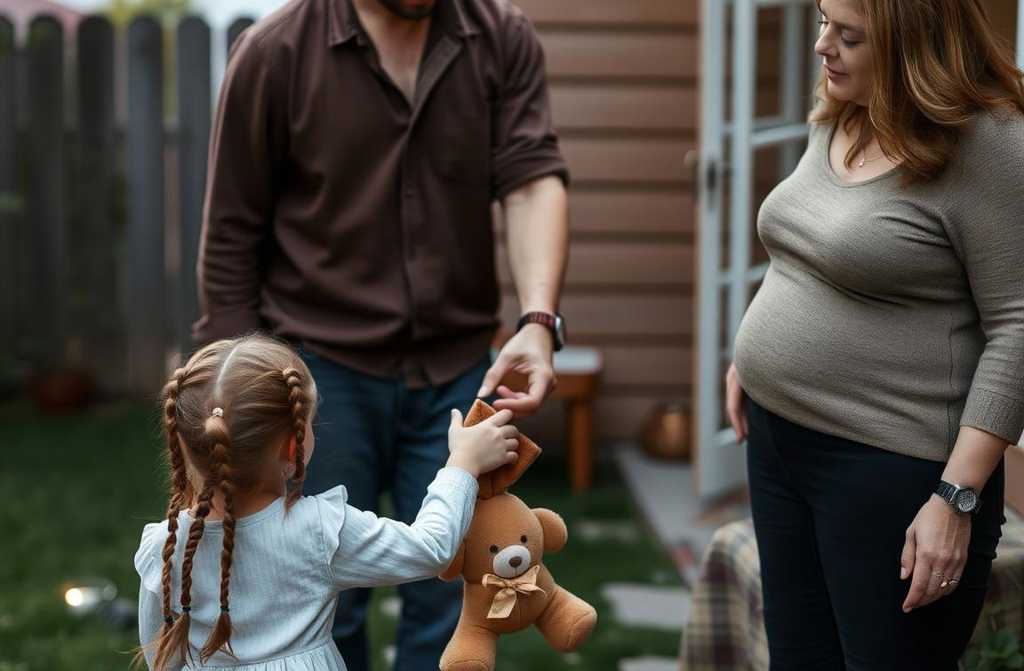 María entró en el patio. Javier arreglaba algo en el garaje, y Carla jugaba feliz con su osito. Él la vio y la miró con recelo. María se detuvo, temblorosa, y entonces Carla se levantó, tomó la mano de su padre y lo guió hacia ella.