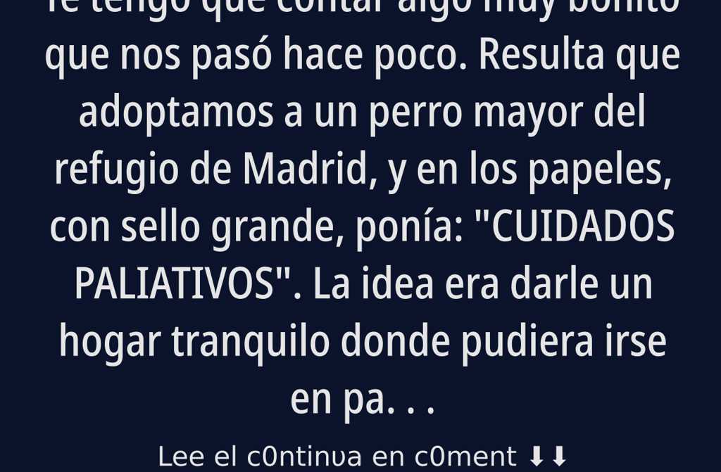 Te tengo que contar algo muy bonito que nos pasó hace poco. Resulta que adoptamos a un perro mayor del refugio de Madrid, y en los papeles, con sello grande, ponía: “CUIDADOS PALIATIVOS”.