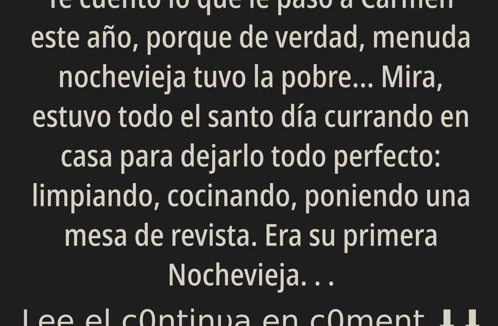 Te cuento lo que le pasó a Carmen este año, porque de verdad, menuda nochevieja tuvo la pobre… Mira, estuvo todo el santo día currando en casa para dejarlo todo perfecto: limpiando, cocinando, poniendo una mesa de revista. Era su primera Nochevieja sin sus padres, solo con su novio, el queridísimo Aurelio.