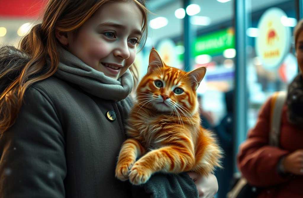 La entrada del supermercado bullía de gente, pero junto a la puerta, inmóvil como una estatua, había un gato atigrado de pelaje anaranjado. Lucía se agachó frente a él y acarició su lomo con suavidad. El animal se arqueó, ronroneando, y de pronto la niña lo abrazó con fuerza, enterrando el rostro en su pelo. Las lágrimas brotaron sin control, y el gato, curioso, las lamía entre pequeños estornudos.