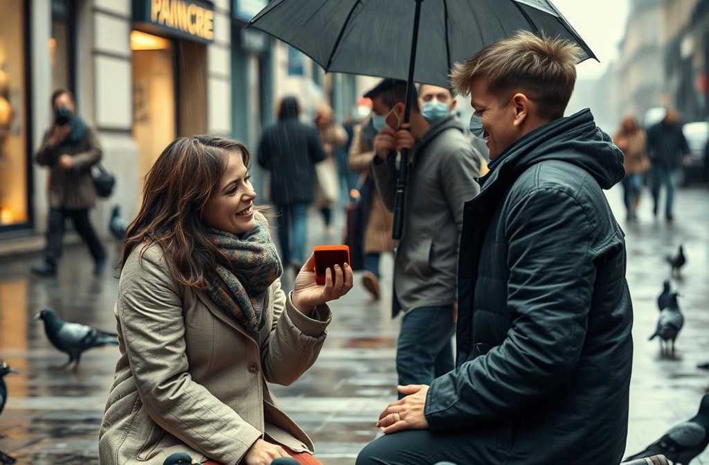 El cielo lloviznaba suavemente, como un delicado telón de agua, mientras la gente pasaba con paraguas abiertos y la mirada baja. Pero nadie prestó atención a la mujer en traje beige que, en medio del cruce, se arrodilló. Su voz temblaba. “Por favor… cásate conmigo”, susurró, sosteniendo una cajita de terciopelo. El hombre al que se dirigía llevaba semanas sin afeitar, vestía un abrigo remendado con cinta adhesiva y dormía en un callejón a solo una manzana de la Gran Vía.