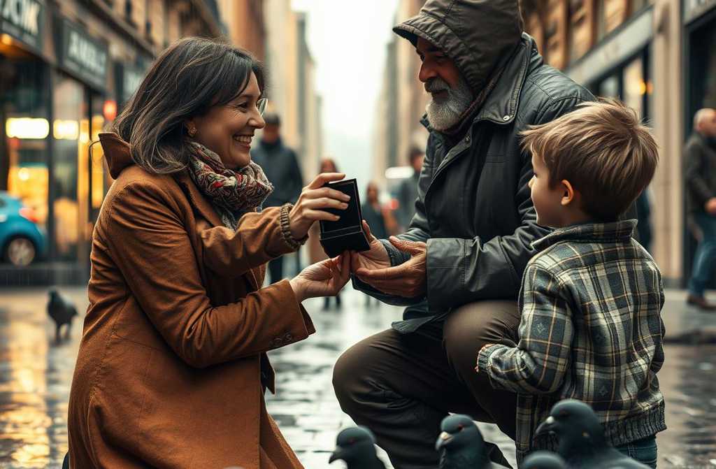 El cielo dejaba caer una fina lluvia, como un suave telón de agua, mientras la gente pasaba con paraguas abiertos y la mirada baja. Pero nadie reparó en la mujer de traje beige que, en medio del cruce, se arrodilló. Su voz temblaba. “Por favor… cásate conmigo”, susurró, sosteniendo una cajita de terciopelo. El hombre al que se lo pedía llevaba semanas sin afeitar, vestía un abrigo remendado con cinta adhesiva y dormía en un callejón a solo una manzana de la Bolsa de Madrid.