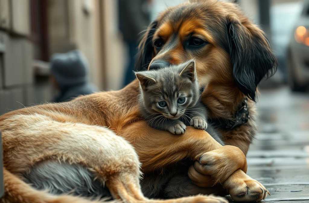 En verano, el gatito creció. El perro, en cambio, adelgazó más. Llegó el otoño, y con él, lluvias interminables. Encontrar rincones secos y cálidos se volvió difícil. A veces, el perro envolvía al gatito entre sus patas, protegiéndolo del frío y la humedad. Temblaba, pero lo lamía. Lo importante era mantenerlo caliente y alimentado.