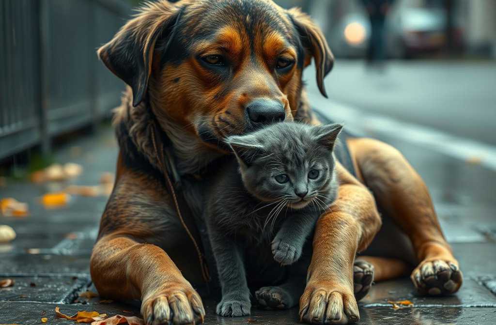 Lo encontró detrás de una esquina, entre latas de basura y cartones mojados. Buscaba algo que llevarse al estómago cuando lo vio: un gatito gris, diminuto, arrastrándose por el asfalto y maullando con desesperación. Frente a él, un perro enorme, sucio y flaco, de un pelaje entre rojizo y grisáceo, cubierto de polvo y barro.