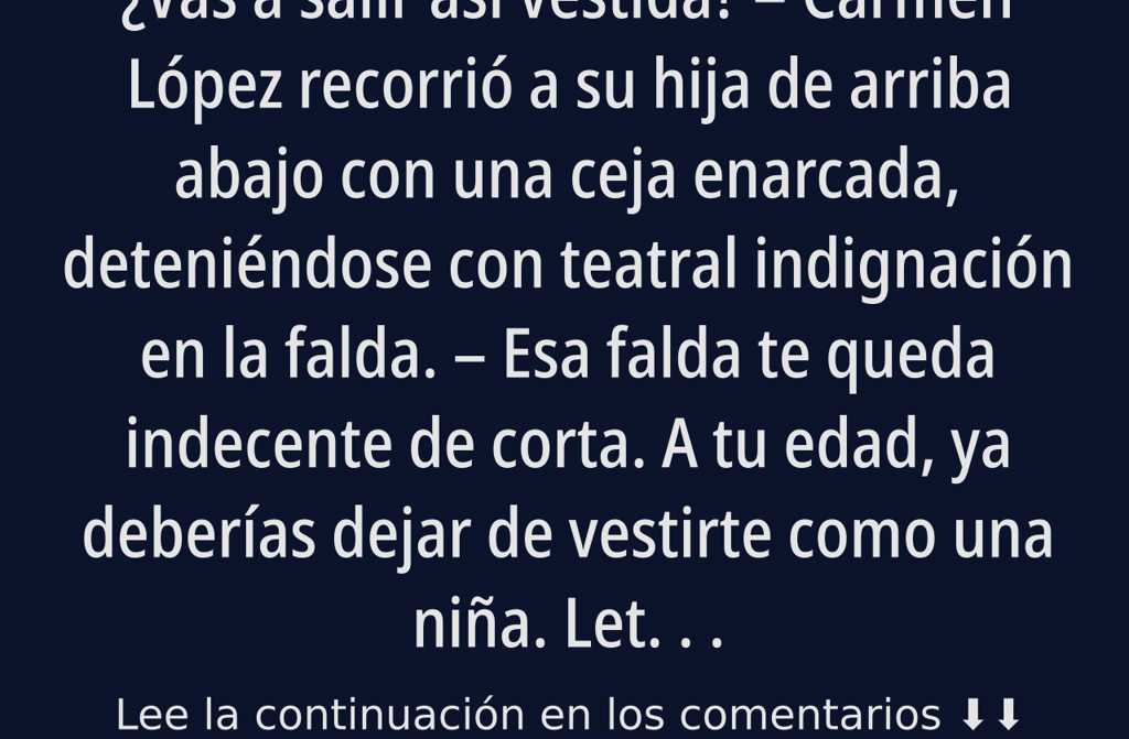 ¿Vas a salir así vestida? Carmen López recorrió a su hija de arriba abajo con una ceja enarcada, deteniéndose con teatral indignación en la falda. Esa falda te queda indecente de corta. A tu edad, ya deberías dejar de vestirte como una niña.