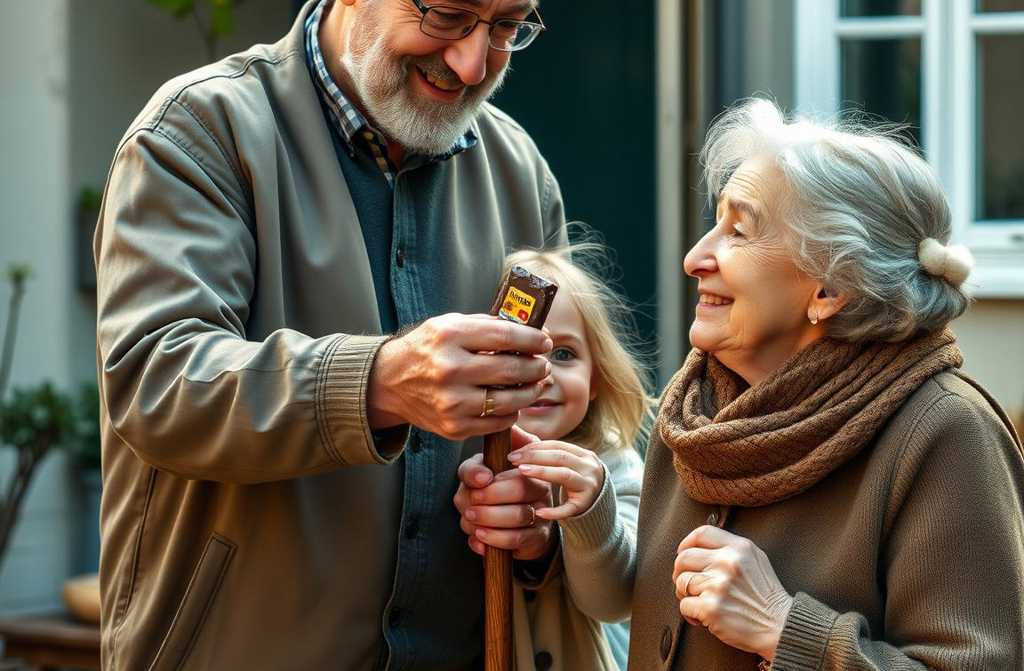 Donato siempre le ofrece a su pequeña vecina una deliciosa bola de chocolate. Cada vez, ella la agradece, la desenvuelve, muerde exactamente la mitad y guarda la otra parte cuidadosamente envuelta en el bolsillo de su chaqueta.