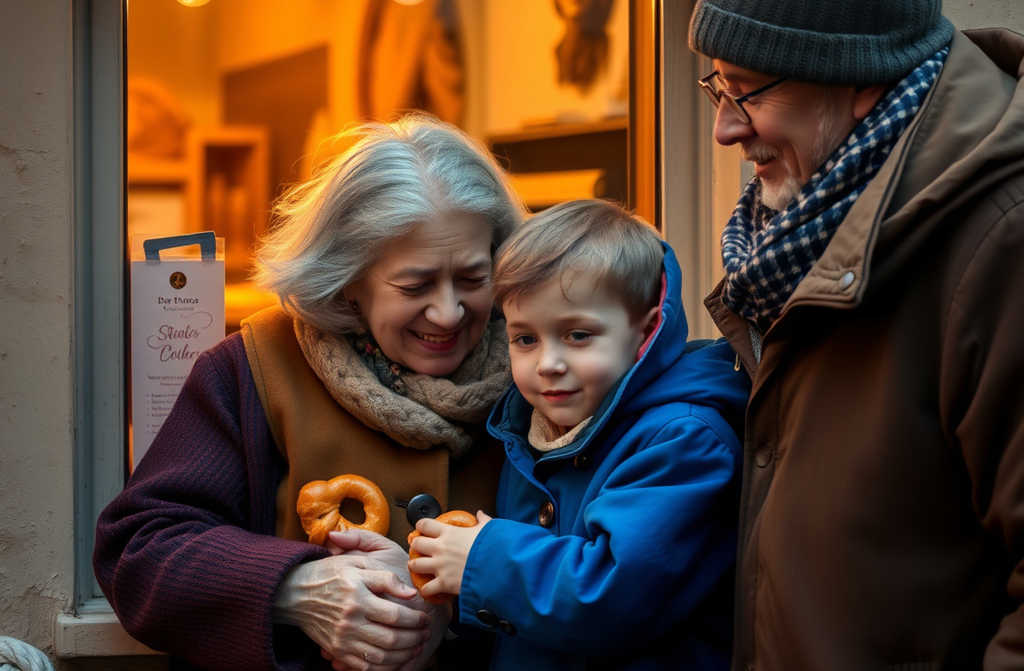 Llegan a una pequeña pastelería de la esquina. En el mostrador, los rosquillos brillan como pequeños soles dorados en un día frío. La joven que atiende, de mejillas sonrosadas, les dirige una sonrisa educada.