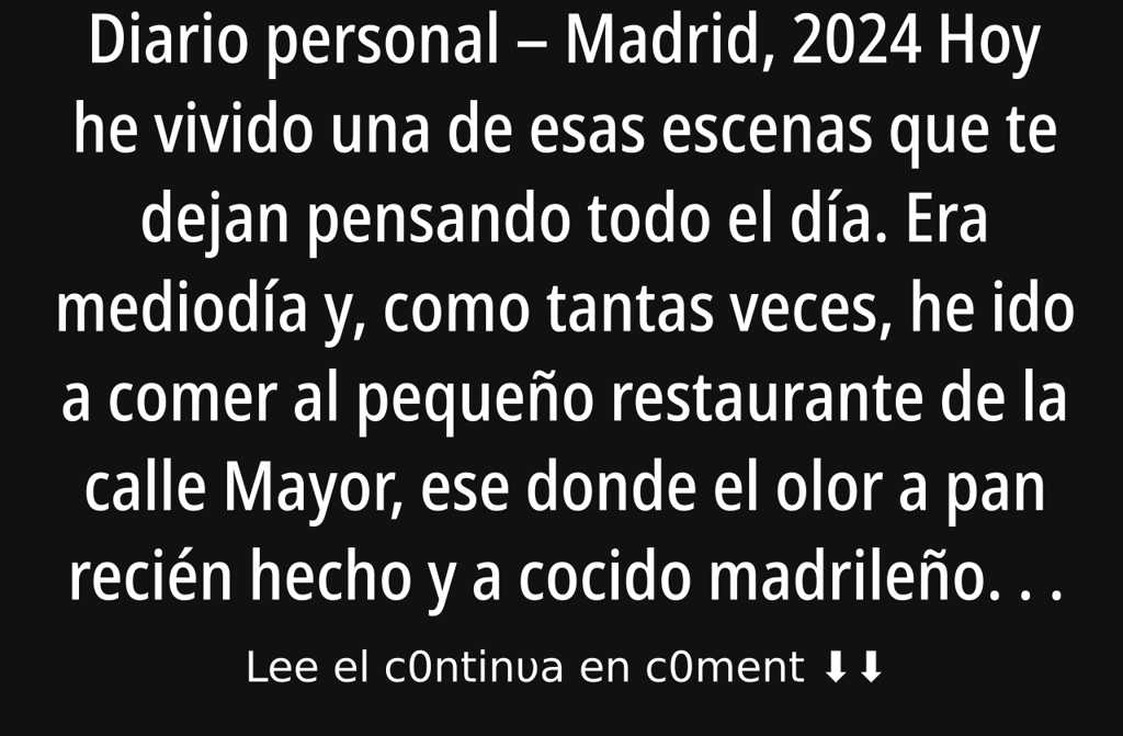 Hoy he vivido una de esas escenas que te dejan pensando todo el día. Era mediodía y, como tantas veces, he ido a comer al pequeño restaurante de la calle Mayor, ese donde el olor a pan recién hecho y a cocido madrileño te da la bienvenida como si fueras de la familia. Me encanta ese ambiente cálido; ahí no solo se va a llenar el estómago, sino también el corazón.