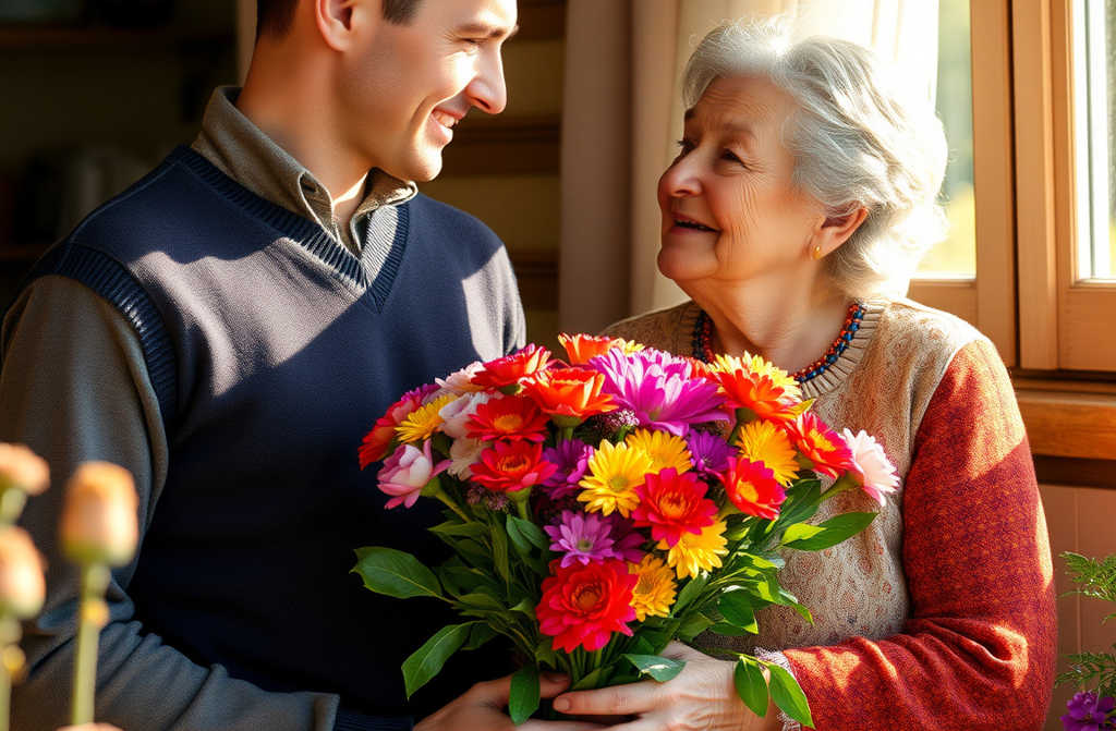 Su madre lo abrazó, llena de alegría, besándole ambas mejillas. A la abuela la ayudaron a incorporarse. Tomó el ramo temblorosa, casi sin ver, palpando los pétalos hacía tanto que nadie le regalaba flores.