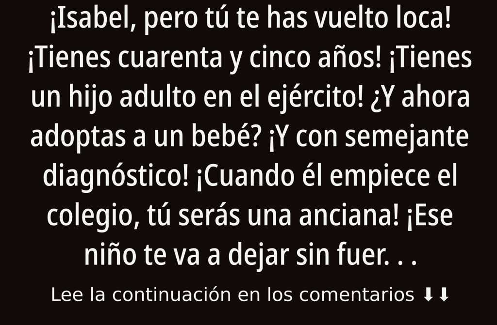 ¡Isabel, pero tú te has vuelto loca! ¡Tienes cuarenta y cinco años! ¡Tienes un hijo adulto en el ejército! ¿Y ahora adoptas a un bebé? ¡Y con semejante diagnóstico! ¡Cuando él empiece el colegio, tú serás una anciana! ¡Ese niño te va a dejar sin fuerzas y te va a llevar a la tumba!