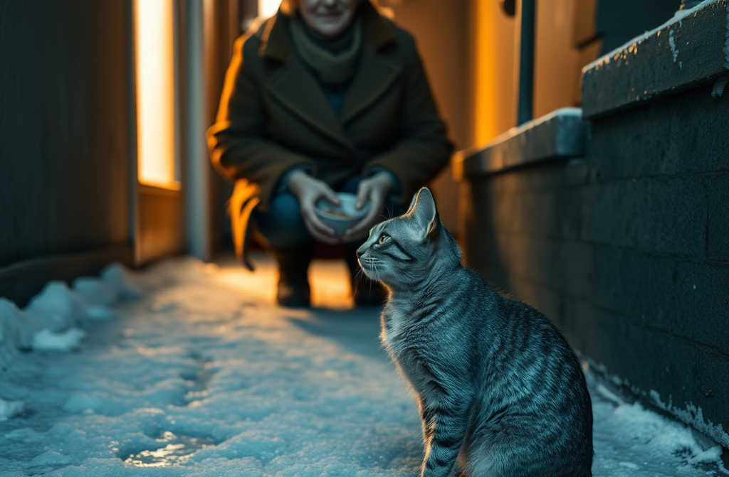 La gata, que había entrado con alguien, se acurrucó junto al radiador en un rincón del rellano, casi sin respirar. Su pelaje estaba cubierto de escarcha, y sus ojos reflejaban súplica y agotamiento.