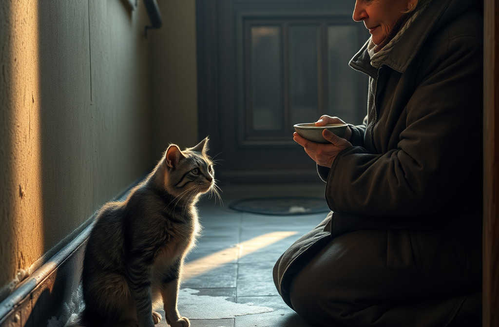 Ella sabía lo que era el hambre. Con sus piernas doloridasherencia de tiempos difícilessubió a su piso y regresó con un plato de comida, agua y un viejo chaleco de lana apolillado.