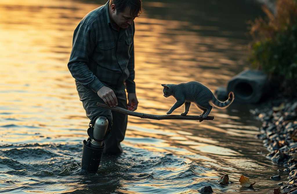 Se quitó la prótesis y la dejó a su lado, entrecerrando los ojos para seguir el movimiento lento de un árbol caído que flotaba sobre las aguas. ¿Se hundiría o no? A mitad de camino, quedó atrapado en un banco de arena. “Ahí se ha quedado”, murmuró Miguel. En diez minutos, cuando subiera el caudal, la corriente lo arrastraría. Pero entonces notó algo extraño: entre las ramas, una pequeña criatura forcejeaba. Al inclinarse, lo reconoció: un gato. Gris, empapado, tembloroso, desesperado por trepar. Ahora estaba en la rama más alta, a unos veinte metros de la orilla, aferrado con sus garras.