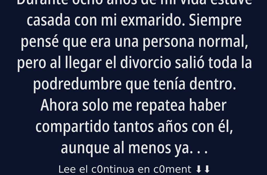 Durante ocho años de mi vida estuve casada con mi exmarido. Siempre pensé que era una persona normal, pero al llegar el divorcio salió toda la podredumbre que tenía dentro. Ahora solo me repatea haber compartido tantos años con él, aunque al menos ya me he librado, que eso es lo importante.