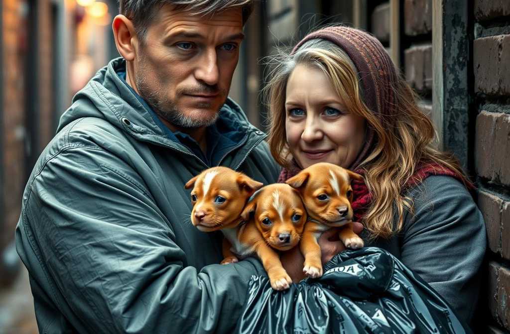 En el fondo del saco, apretados como un pequeño bulto tembloroso, había dos cachorritos. Eran ciegos, su pelaje estaba mojado y cubierto de barro, pero estaban vivos. Sus diminutos cuerpos subían y bajaban al ritmo de su respiración. Con el corazón acelerado, tomé uno en la palma de mi mano; era tan frágil y desprotegido. Luego, con cuidado, recogí al otro y los acerqué a mi pecho, bajo la chaqueta, intentando darles calor. Sentí sus pequeños latidos sincronizarse con el mío, latiendo frenéticamente.