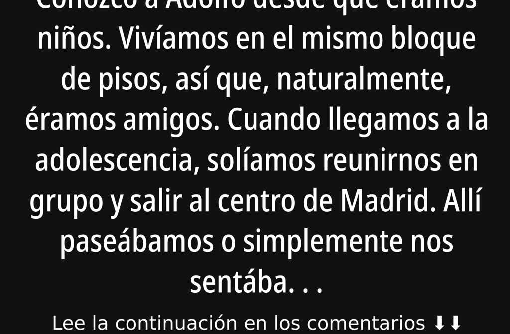 Conozco a Adolfo desde que éramos niños. Vivíamos en el mismo bloque de pisos, así que, naturalmente, éramos amigos. Cuando llegamos a la adolescencia, solíamos reunirnos en grupo y salir al centro de Madrid. Allí paseábamos o simplemente nos sentábamos en algún banco de la Gran Vía. Las relaciones con las chicas no nos las tomábamos demasiado en serio; nos preocupaba más qué pensarían los amigos: no queríamos hacer el ridículo delante de ellos.