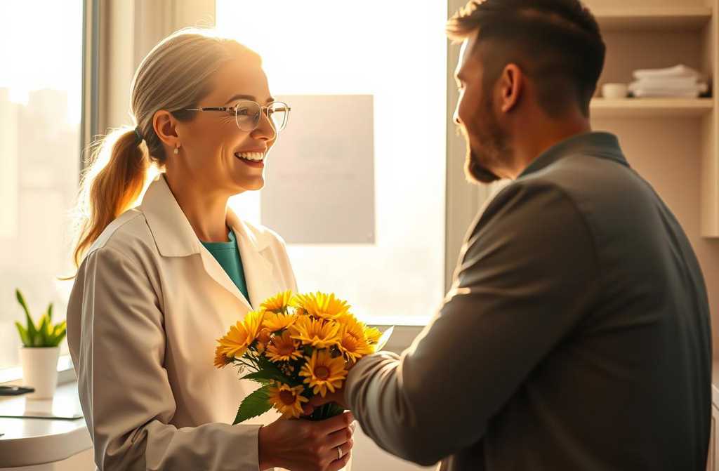 El lunes siguiente, Procopio apareció frente a la clínica con un gran ramo de flores, mirando su reloj. Los colegas lo observaban intrigados, preguntándose quién sería el afortunado. Cuando Dolores se acercó, él le entregó el ramo.