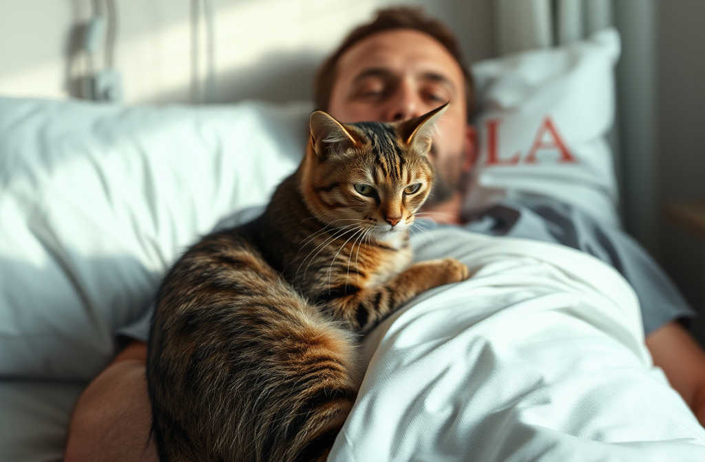 El trayecto nocturno a través de Madrid parece infinito. Cada semáforo es una tortura. Piensa en la última vez que visitó a su padre. ¿Tres, cuatro semanas? Ya ni lo recuerda. Al llegar, corre por los pasillos vacíos hasta la 312. La puerta entornada y voces al otro lado. Suspira hondo y empuja. Lo que ve la deja boquiabierta: un gato atigrado, flaco, está tumbado junto a su padre, ronroneando alto.