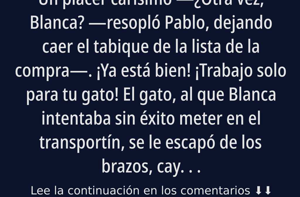 ¿Otra vez, Blanca? resopló Pablo, dejando caer el tabique de la lista de la compra. ¡Ya está bien! ¡Trabajo solo para tu gato!