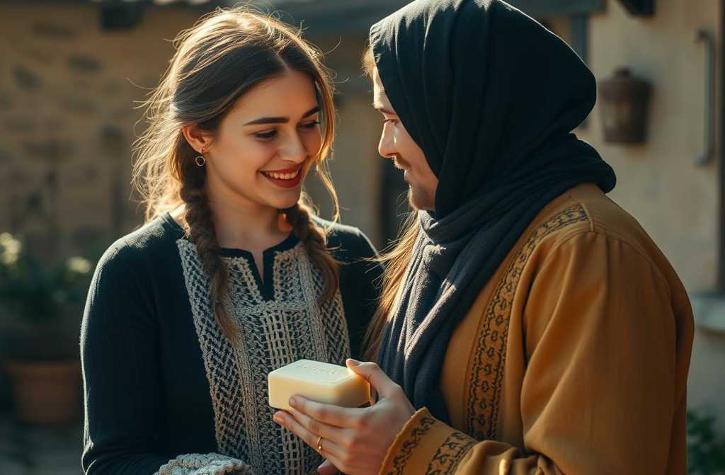 Catalina, sin saber qué decir, sostuvo el trozo de jabón con la etiqueta “Hogar”. Le resultó gracioso y, a la vez, la hizo reflexionar: todos los otros pretendientes le ofrecían palabras vacías y promesas, pero él le había traído algo que realmente pensaba en ella.