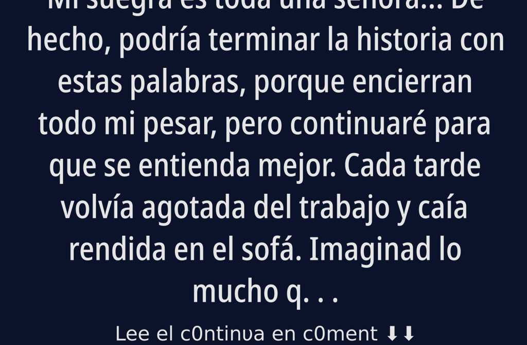 Mi suegra es toda una señora… De hecho, podría terminar la historia con estas palabras, porque encierran todo mi pesar, pero continuaré para que se entienda mejor. Cada tarde volvía agotada del trabajo y caía rendida en el sofá. Imaginad lo mucho que, en esos momentos, desearía tener fuerzas para preparar algo de cenar para mi prometido. Un día, al llegar a casa, escuché a mi esposo hablando por teléfono. Por lo visto, acababa de empezar: