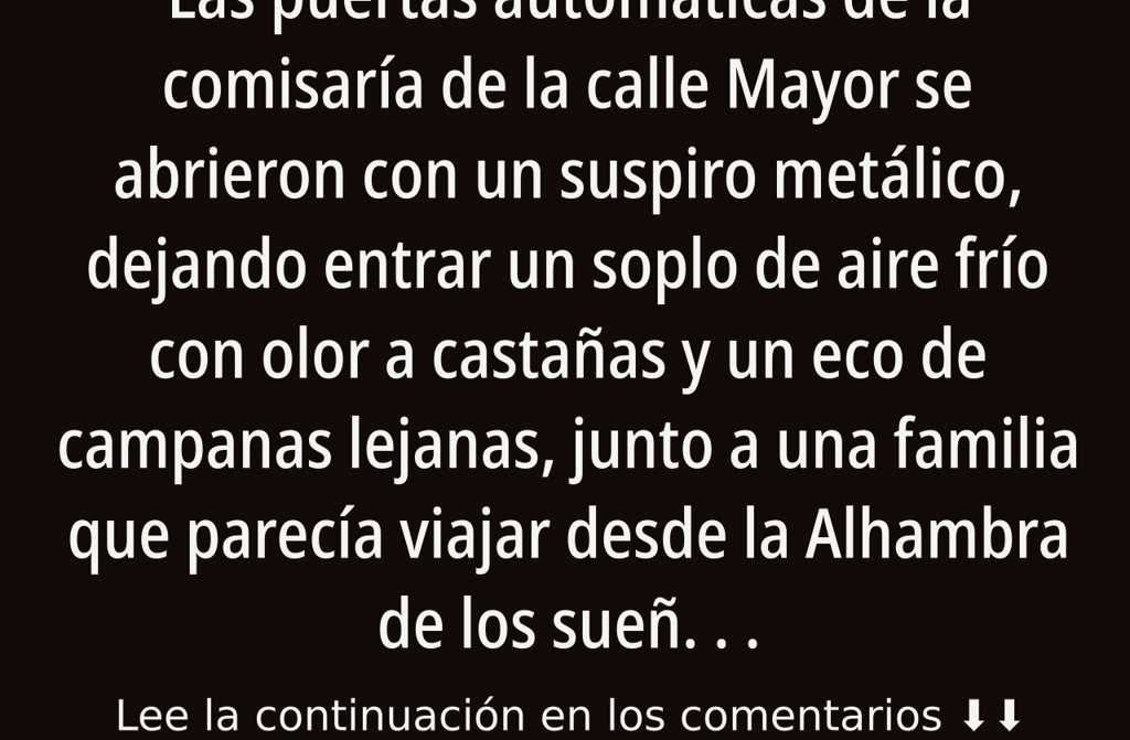Las puertas automáticas de la comisaría de la calle Mayor se abrieron con un suspiro metálico, dejando entrar un soplo de aire frío con olor a castañas y un eco de campanas lejanas, junto a una familia que parecía viajar desde la Alhambra de los sueños, arrastrando la fatiga de varias noches sin luna.