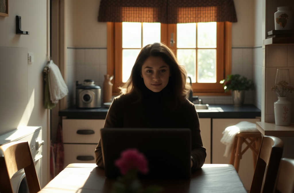 Aurora está fregando los platos en la cocina cuando entra Enrique. Antes de aparecer, apaga la luz de la cocina.