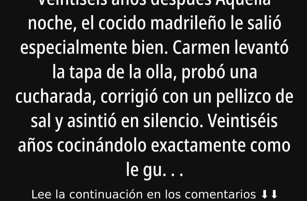 Aquella noche, el cocido madrileño le salió especialmente bien. Carmen levantó la tapa de la olla, probó una cucharada, corrigió con un pellizco de sal y asintió en silencio. Veintiséis años cocinándolo exactamente como le gustaba a Tomás: espeso, con garbanzos tiernos, morcilla del pueblo y ese toque final de pimentón y hierbabuena, añadido en el último minuto porque de lo contrario el aroma se perdía. Puso la mesa en el salón, repartió el pan candeal, colocó su taza favorita, aquella de esmalte ya algo oscuro y mellado que él se negaba a tirar desde hacía años.