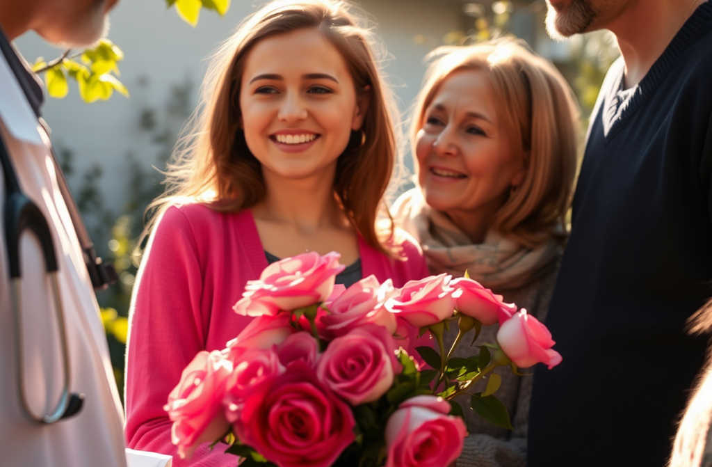 Inés apenas pudo creer lo que veía: por primera vez vio el mundo con claridad, el ramo y al apuesto médico de ojos grises. Lloró de alegría y Javier se apresuró a consolarla.