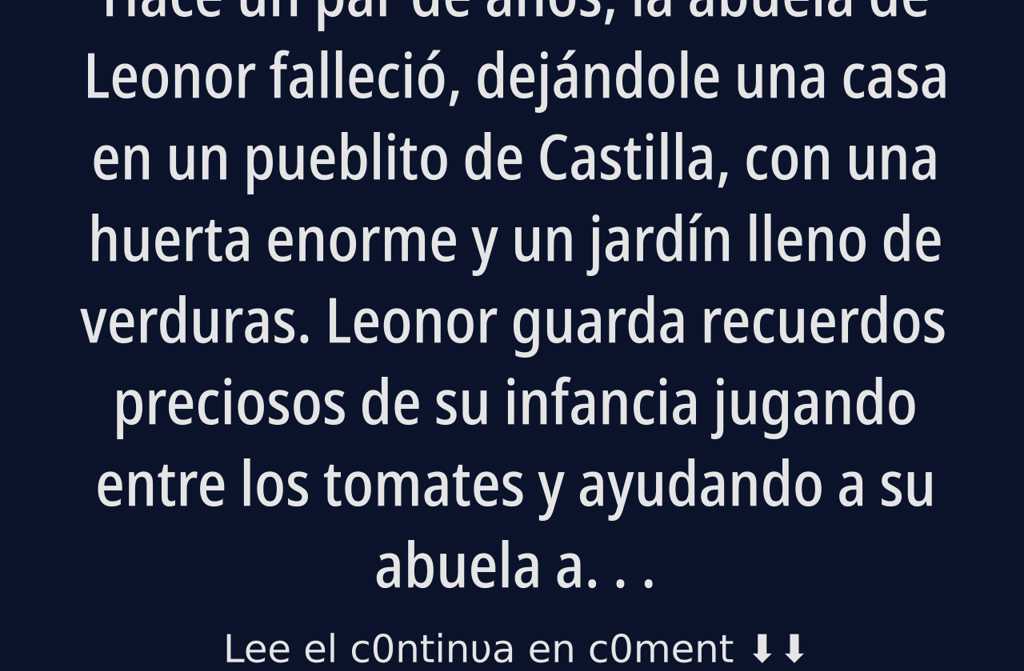 Hace un par de años, la abuela de Leonor falleció, dejándole una casa en un pueblito de Castilla, con una huerta enorme y un jardín lleno de verduras. Leonor guarda recuerdos preciosos de su infancia jugando entre los tomates y ayudando a su abuela a preparar la merienda. Todos los fines de semana, ella iba con su familia y su suegra a disfrutar del aire puro y de las frutas recién cogidas del árbol. La relación con su suegra era más tranquila que una tarde de domingo, sin peleas ni discusiones, una maravilla.