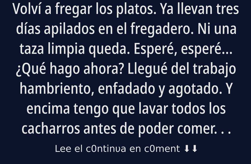 Volví a fregar los platos. Ya llevan tres días apilados en el fregadero. Ni una taza limpia queda. Esperé, esperé… ¿Qué hago ahora? Llegué del trabajo hambriento, enfadado y agotado. Y encima tengo que lavar todos los cacharros antes de poder comer algo.